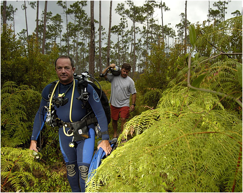 Great Abaco Island, the northernmost island in the Bahamas, is a short, 40-minute flight from the east coast of Florida, and for the last 50 years has been regarded predominantly as a yachting and fishing paradise. The crystal clear waters of the Atlantic hold scores of fish, while dozens of small, quaint islands called Cays (pronounced “keys”), to the north and east of the main island, create bays and harbors which are the stuff of picture post-cards. But it is the warm pine forests and shallow tidal creeks of the main island that hold the treasures sought after by so many cave divers. When discussing cave exploration on Abaco, a new list of explorers comes to light. Steve Omeriod, Dennis Williams, Gene Melton, Rafe Palmeroy, Fred Davis, Dan Malone, and Kenny Broad join the list of divers who have pushed into the nearly 100 known blue hole entrances located on or near the island.