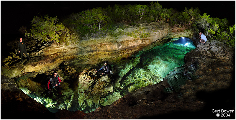 The ocean caves and blue holes of Abaco are truly natural wonders. These caves are usually fracture or solutional caves, and are located off shore or in shallow tidal creeks and lakes throughout the island. Ocean caves are usually tidally influenced, making cave diving a challenging effort. Each cave has its own lag time (time of slack current) with relation to the tides. As the tides move on and off the shallow banks, and in and out of tidal creeks, the caves act as conduits for the moving water. This means that currents in some of these caves can be so strong that diving during the wrong part of the tidal cycle can have disastrous results.