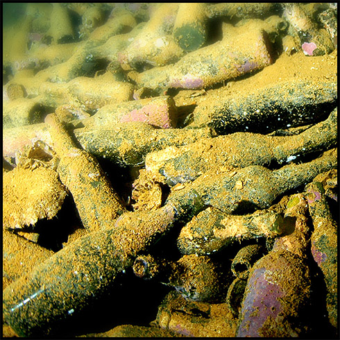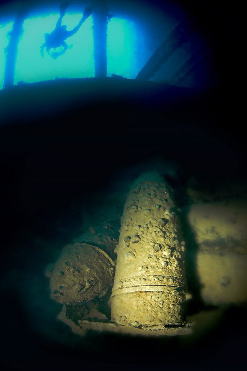Below: Scattered throughout cargo hold #5, these 14-inch diameter artillery shells were destined for one of the large Japanese battleships, Yamato or Musashi. |