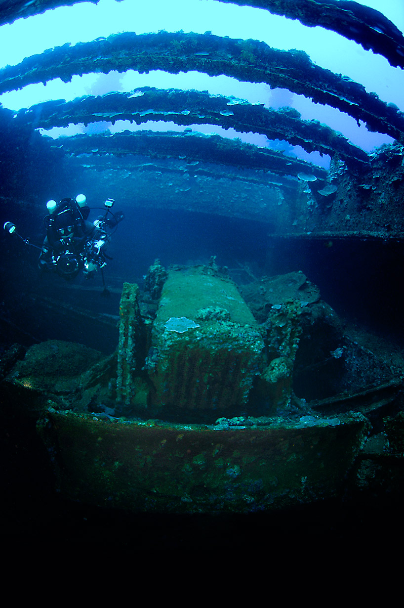 The Momokawa has an interesting engine room but the lower levels can become confusing because of her lying on the port side. A diver must remember that, up is not the way out.