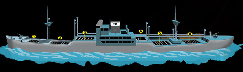 Twin torpedoes struck the forward holds one and two. These holds were loaded with hundreds of 55 gallon gasoline barrels. The detonation from the torpedoes within the barrels of gasoline triggered such a massive explosion that it almost desinigarted most of the ship forward the pilothouse. The massive explosion and fireball also consumed most of the pilothouse, galley, and engine room and crews quarters. Ripping the ship in half the flames were quickly extinguished by the flooding seawater as she sank within minutes. |
