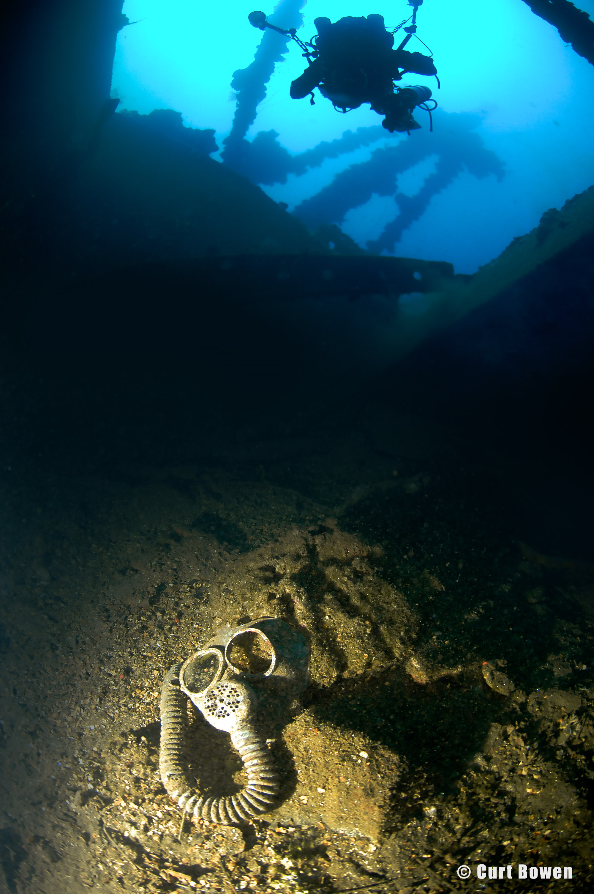 Above: Exploring deep into the third engine room level of the Heian Maru, CCR diver Ron Benson discovers this engine room telegraph and engine pressure gauge panel.