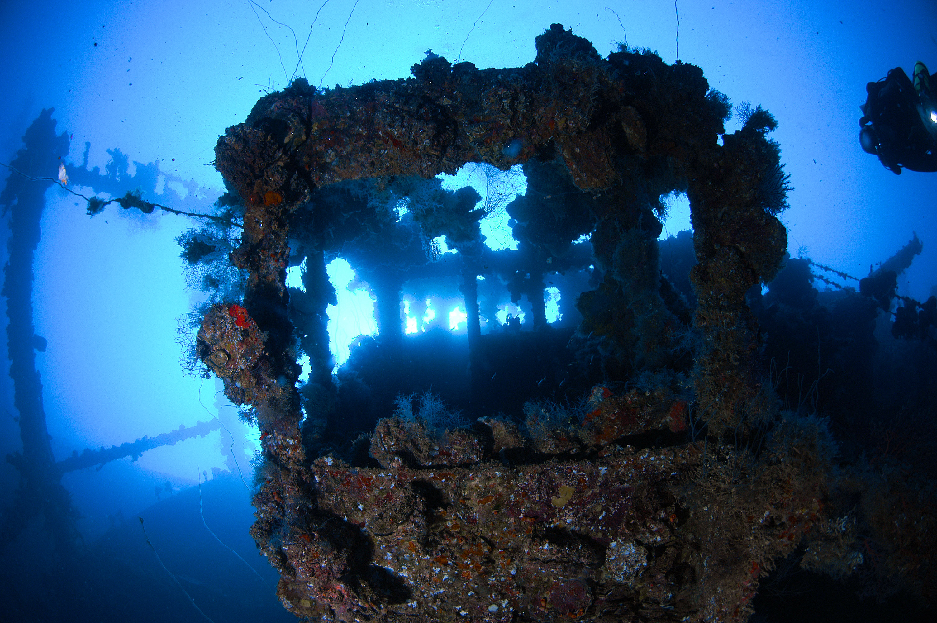 Exiting the cargo hold and swimming towards the stern you will pass the upper super structure and over the engine room.