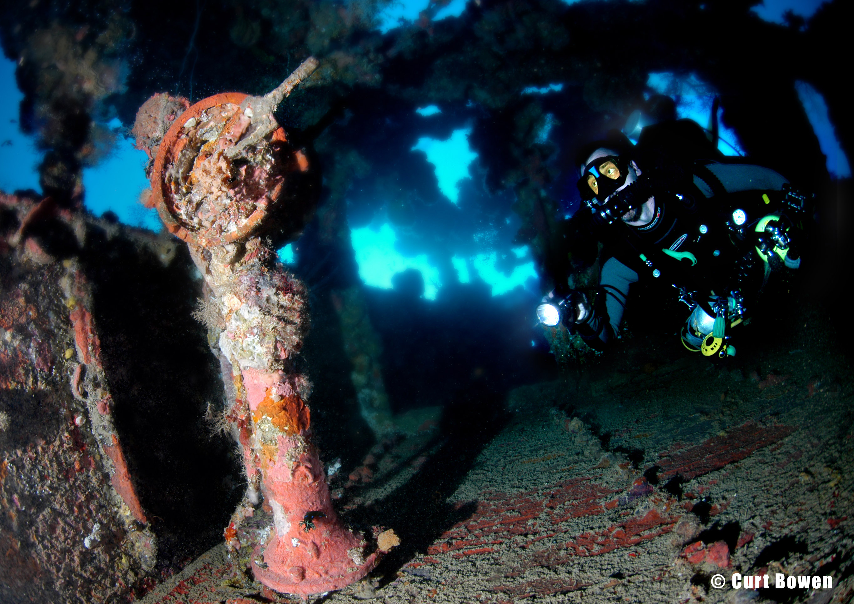 Cover Photo (TOP): Closed circuit rebreather diver Jim Rozzi explores the bow deck artillery on the San Francisco Maru.