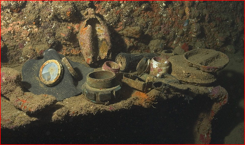 But it’s the “deep end” of the ship that really fascinates me. Only a minority of visitors get to see this part of the ship in any detail. As you pass the 55-meter mark, the gloom around the ship becomes more tangible and a feeling of excitement grows. Currents often spring up on the sand around the stern that can pull the unwary out to sea. Our HID lights cut a swathe through the dark blue water illuminating the massive propeller shafts, the stern rail, and are then lost into the black void beyond the back of the ship. Countless objects lie half-buried in the sand around the wreck, all begging closer scrutiny but there never seems to be enough time to stop and look at the detail.