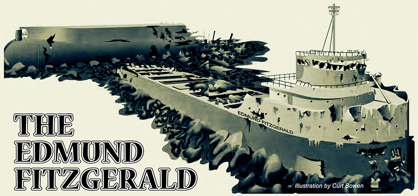 The Edmund Fitzgerald sank on November 10th, 1975 seven- teen miles northwest of White Fish Point in Lake Superior. The Fitzgerald, a 729 foot iron-ore carrier, was loaded with 27,300 tons of taconite ore and was headed for Detroit, Michigan. At 2:00 a.m. The Fitzgerald slammed into a severe weather mass. The Fitzgerald 's captain tried to avoid the worst of the storm by steering towards the north. The ship held its own for a while but the pumps, capable of pumping 32,000 gallon per minute, proved inadequate for the tremendous amount of water pouring in from the rain and crashing waves. By 3:30 p.m. the Fitzgerald developed a list. Trailing behind the Fitzgerald was another freighter, the 767 foot Arthur M. Anderson, also trying to survive the storm. At 7:10 p.m. Captain Mcsorley of the Fitzgerald radioed to Captain Cooper of the Anderson, calmly saying, "We're holding our own." Ten minutes later, the Anderson's radar showed no image of the Fitzgerald. The vessel had vanished.