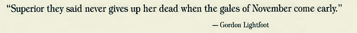 The loss of the Fitzgerald and the entire crew of twenty-nine, represents one of the most tragic shipwrecks in modern history. I contemplated this loss while standing on a jetty reaching out into Lake Superior. The jetty was shaking from the impact of the colliding waves. I could hardly believe that this was the same body of water that only hours before had reflected, mirror like, canopy of stars overhead . There would be no diving today. Once again Gitchegumee, as Lake Superior is known in Indian legend, had taught a human the meaning of the word humility. |
