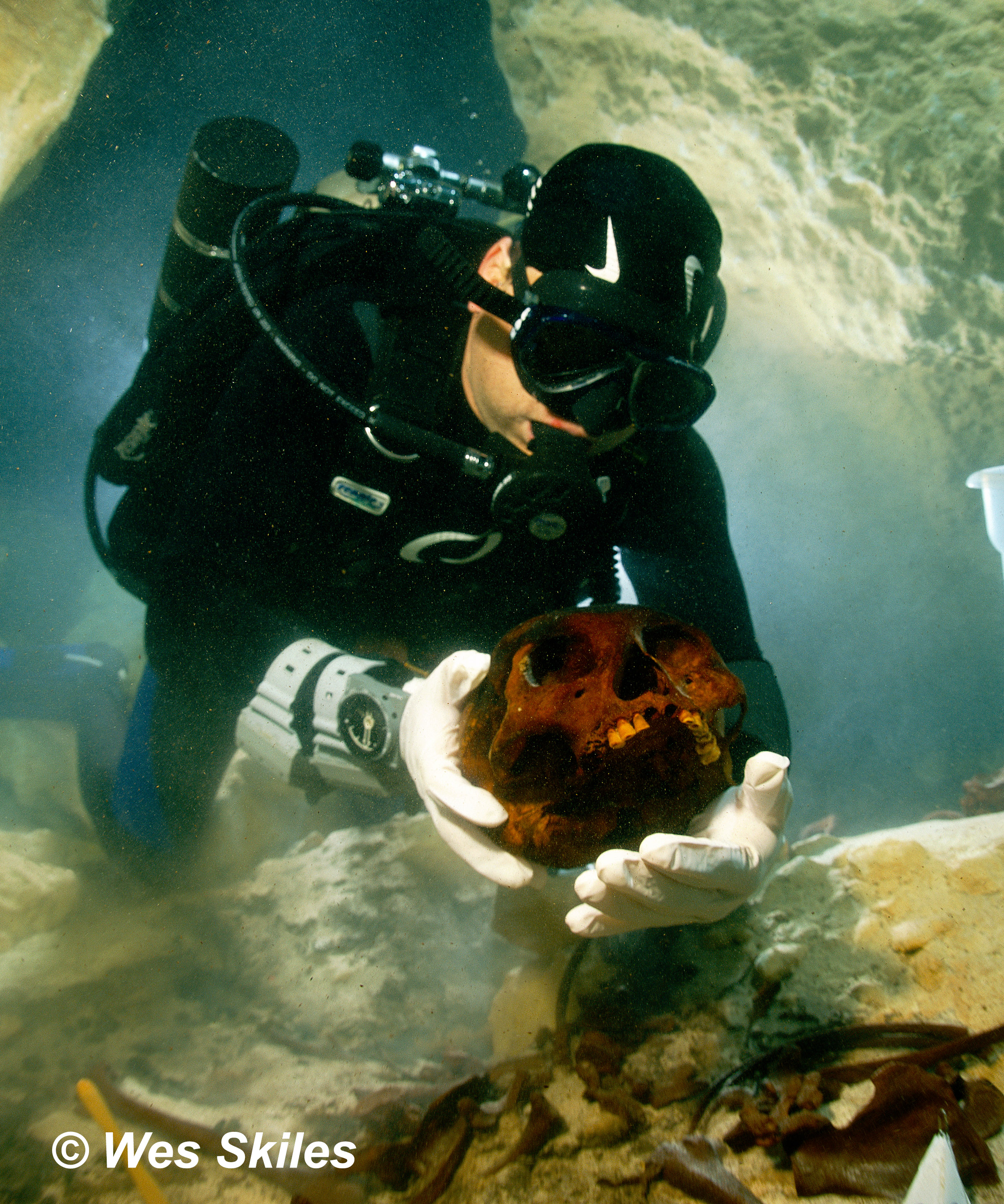 | Above: Underwater archeologist carefully excavate human remains of ancient Maya from where they have laid undisturbed for over 800 years |