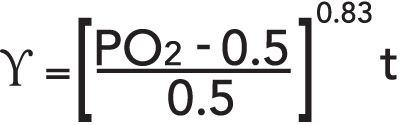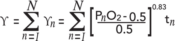 The CNS data in Table 1 is easily fitted to a dose time curve, using least squares, yielding, or, equivalently, in the same units, that is pO2 and tχ in atm and min respectively. The last column tabulates a pulmonary exposure dose, Υ, for divers, called the oxygen tolerance unit (OTU), developed by Lambertsen and coworkers at the University of Pennsylvania. Formally, the oxygen tolerance, Υ, is given by, and can be cumulatively applied to diving exposures according to the following prescriptions |
