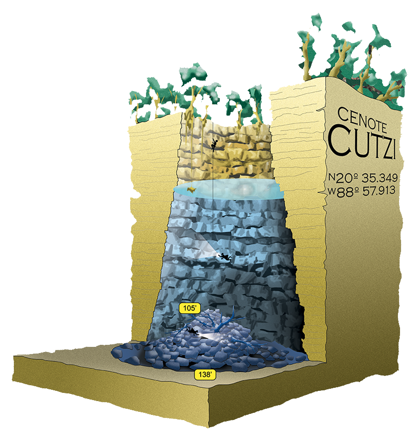 Below: Artist’s rendition of what the exploration team observed within the depths of Cenote Cutzi. Maximum depth explored was 139 feet. |