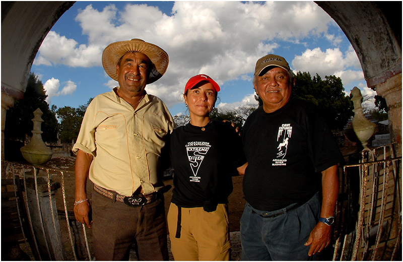 Above: Elmer (far right) is the Jedi Cenote Master and legend lover of the Yucatan. It is rumored that Elmer has over 90 children with family in every village throughout the Yucatan. Elmer is a water pump mechanic by trade and spends every day in local Ranchos fixing pumps that draw water from Cenotes for the farmer’s cattle. A key person to help gain access into private property, Elmer is worth every grande coke we pay him. Next to Elmer is team member Norma Garcia and just one of Emers possible children. |