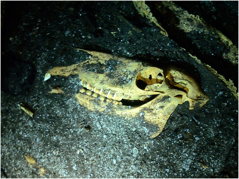Above: Remarkably, a horse skeleton is discovered in the cenote. Could this be the fabled white horse that’s siren song lured people to their deaths be true? The farmer face turned pale when we showed him the horse skeleton photo. |