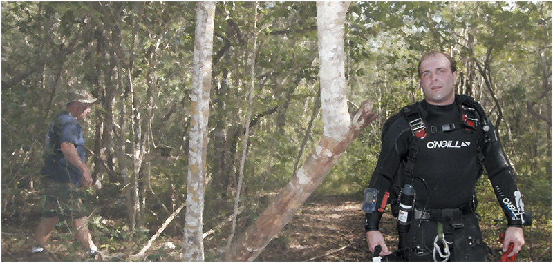 Above: A strange sight for any passing cattle rancher, diver Matt Mandzieuk dresses in full side-mount and climbing equipment, makes his way through the Yucatan scrub jungle to be the first to explore the bottom of Cenote Cutzi.
