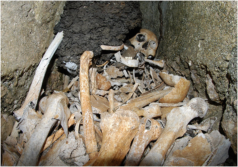 Kim Smith will snorkel the well while explorer Matt Mandzieuk will make the initial dive. Matt discovers a large cave with human and animal remains at a depth of about 60 feet. The artifacts are mostly buried, and we strictly enforce the no-touch rule, but enough of the remains are visible to photograph. I gear up and head down the well, followed shortly by a tank and my underwater camera gear.
