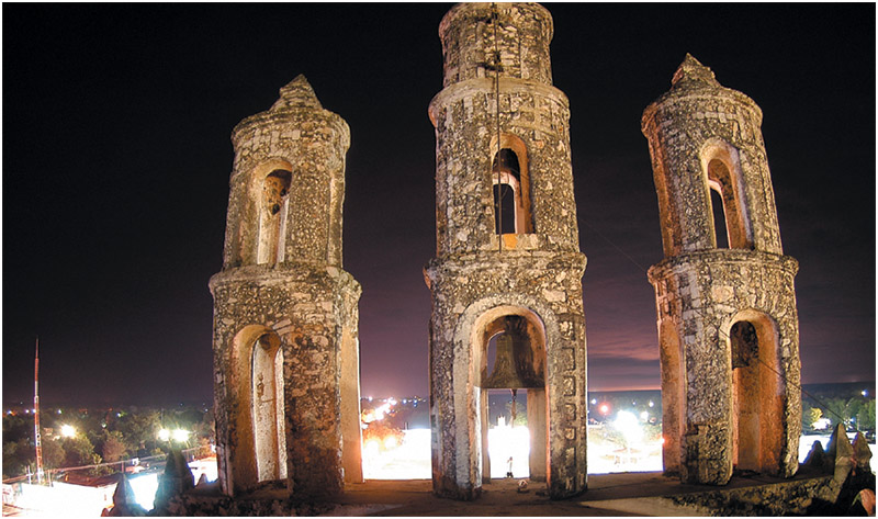 Above: Triple bell towers rise above the small village of Homun, Mexico. Homun is located just to the south east of Merida.