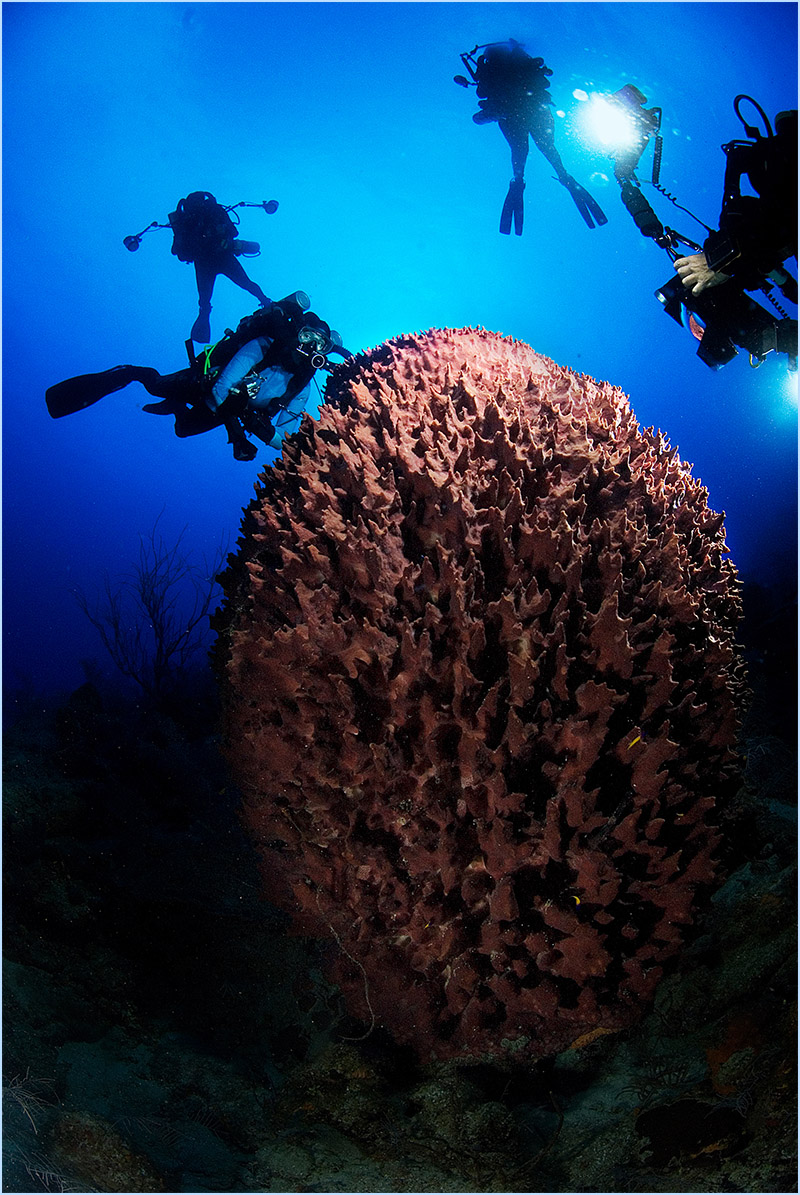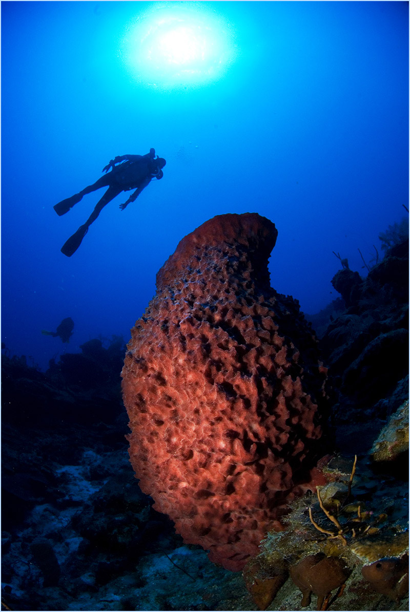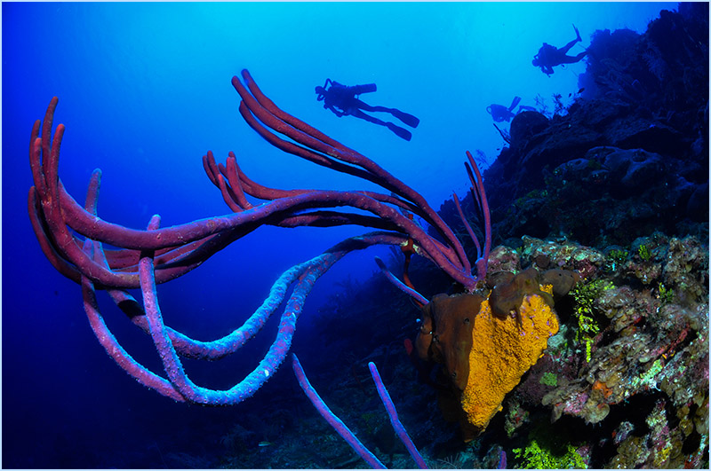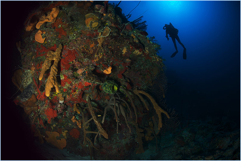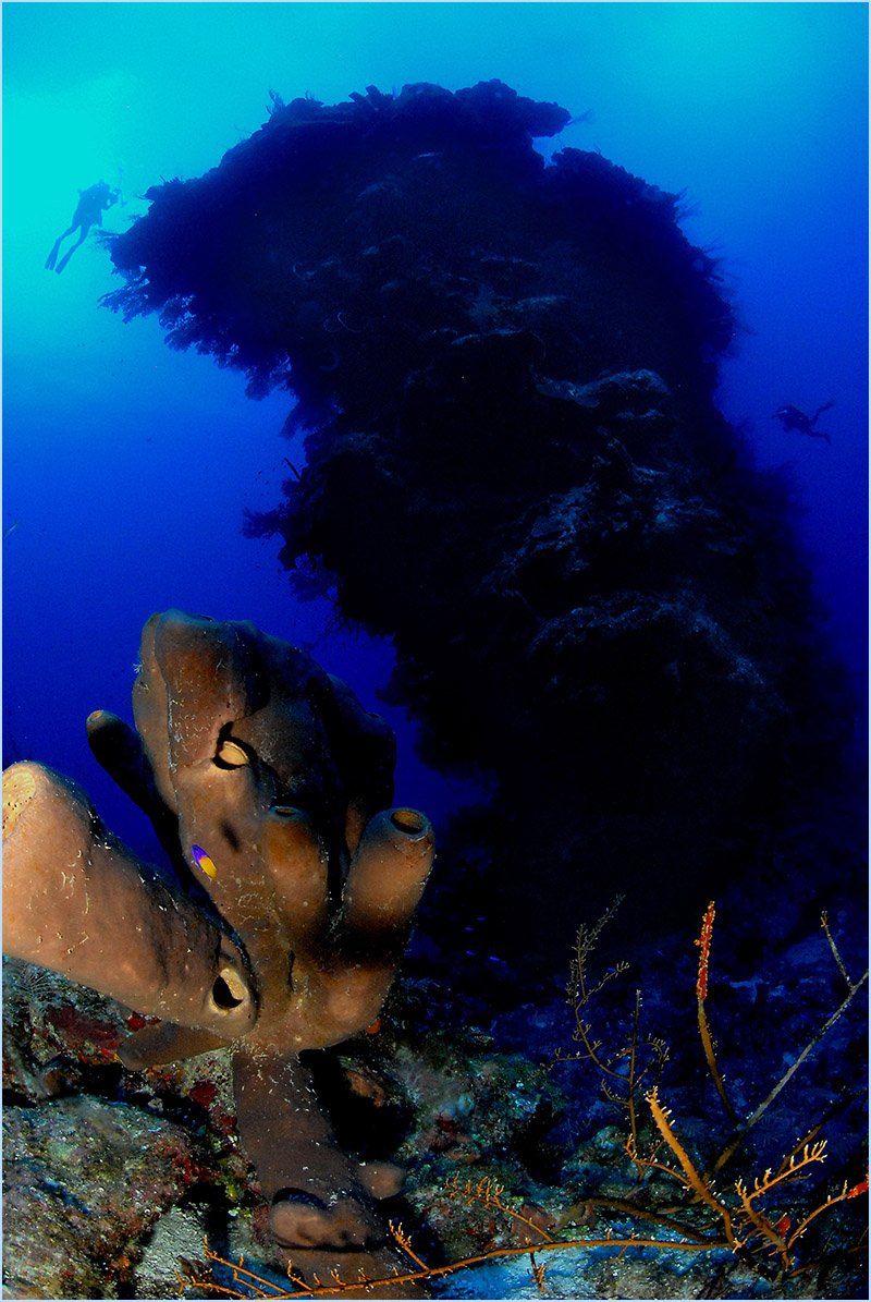 As your dive continues, you’ll feel the current intensify once you approach the edge of a large pinnacle where sea-life flourishes in the nutrient-rich water. Prepare to be astounded by the extremely immense orange and red elephant ear coral sponges, beautifying the edge of the apex, some reaching 15 feet or larger. You’ll want to take time to experience the sight of the long yellow and orange tube sponges host an abundance of tiny creatures that make the perfect subjects for macro photography.