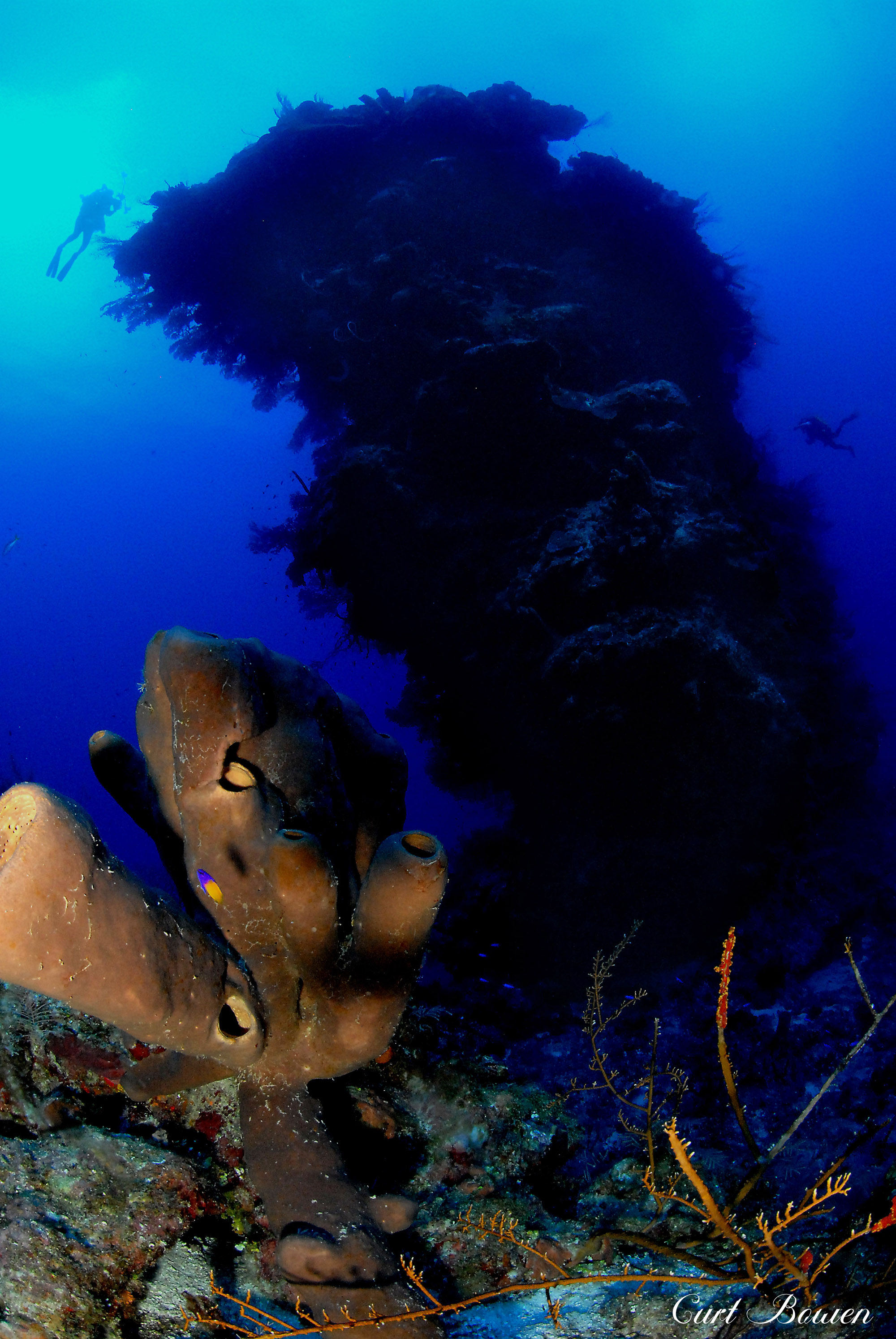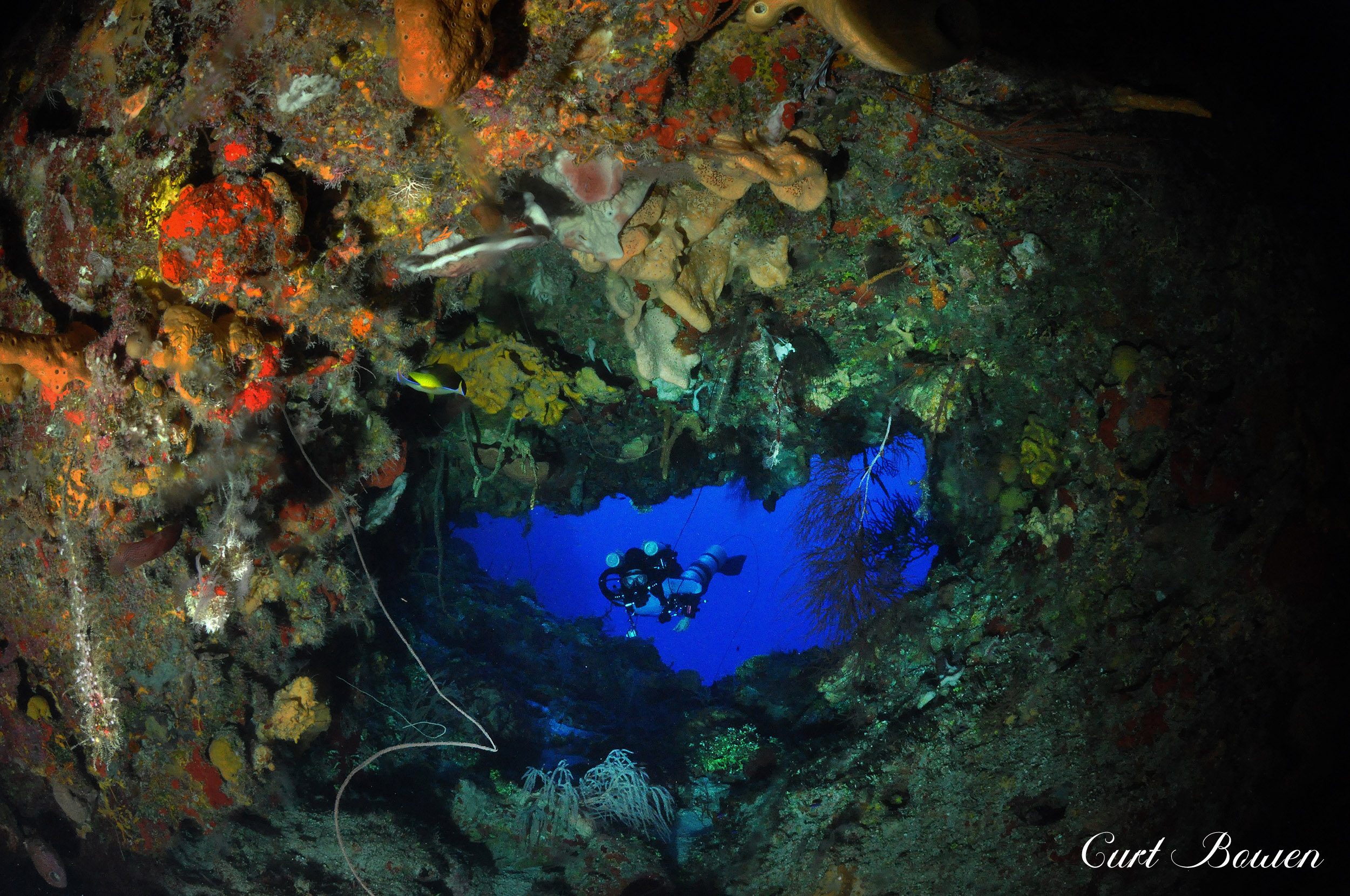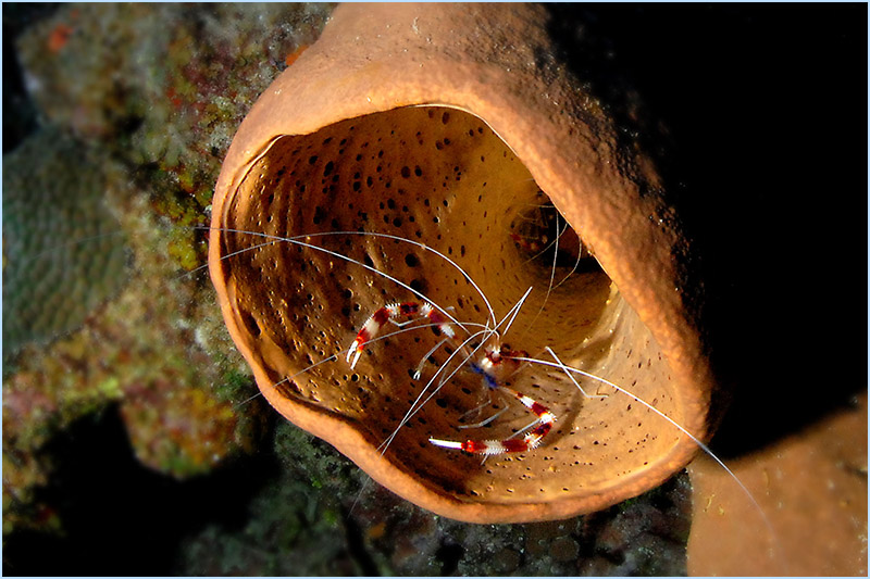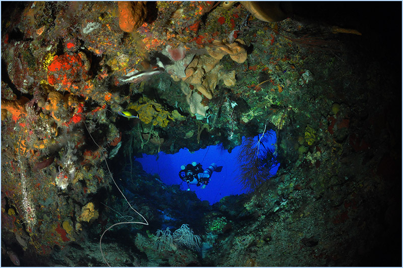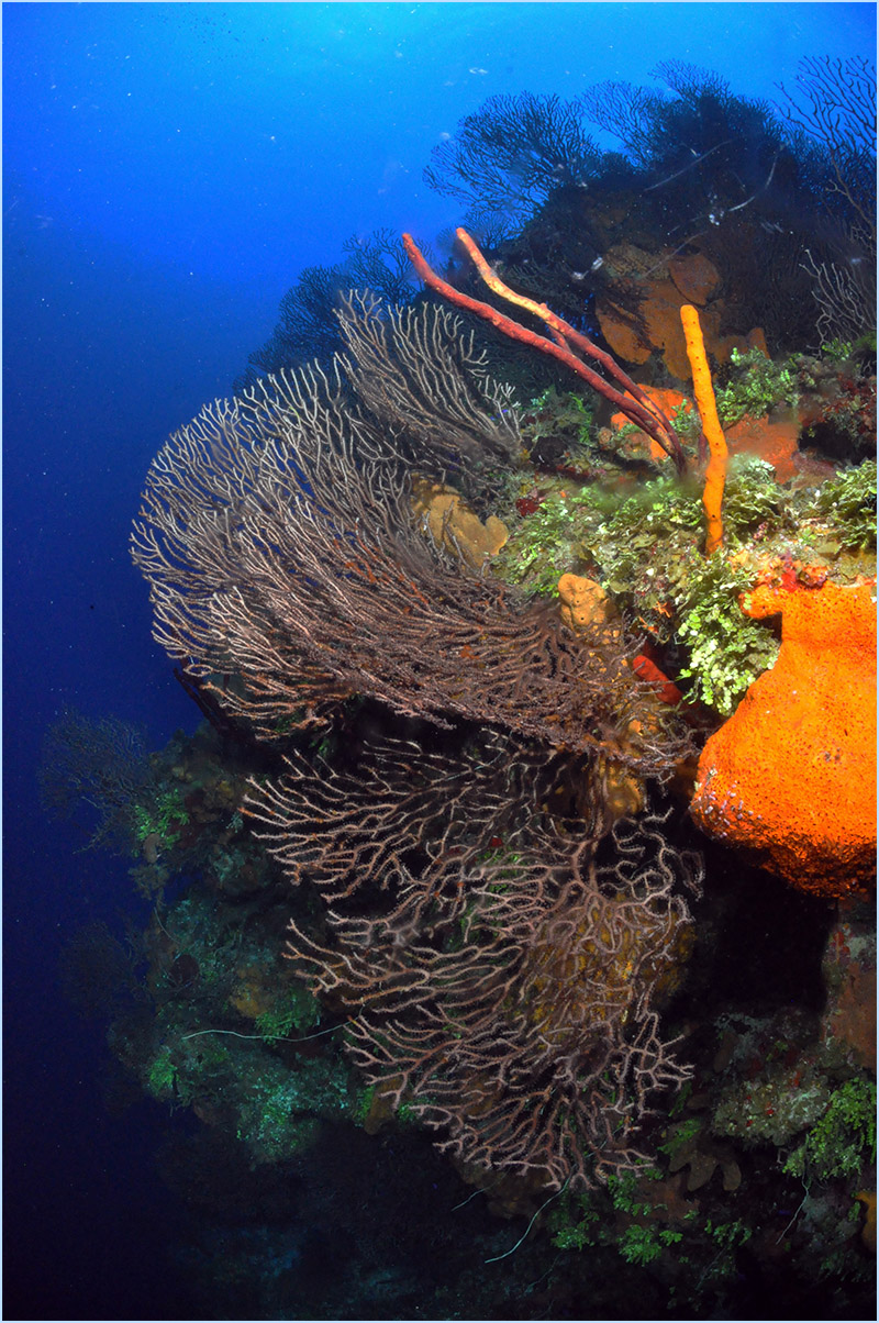 As your dive continues, you’ll feel the current intensify once you approach the edge of a large pinnacle where sea-life flourishes in the nutrient-rich water. Prepare to be astounded by the extremely immense orange and red elephant ear coral sponges, beautifying the edge of the apex, some reaching 15 feet or larger. You’ll want to take time to experience the sight of the long yellow and orange tube sponges host an abundance of tiny creatures that make the perfect subjects for macro photography.