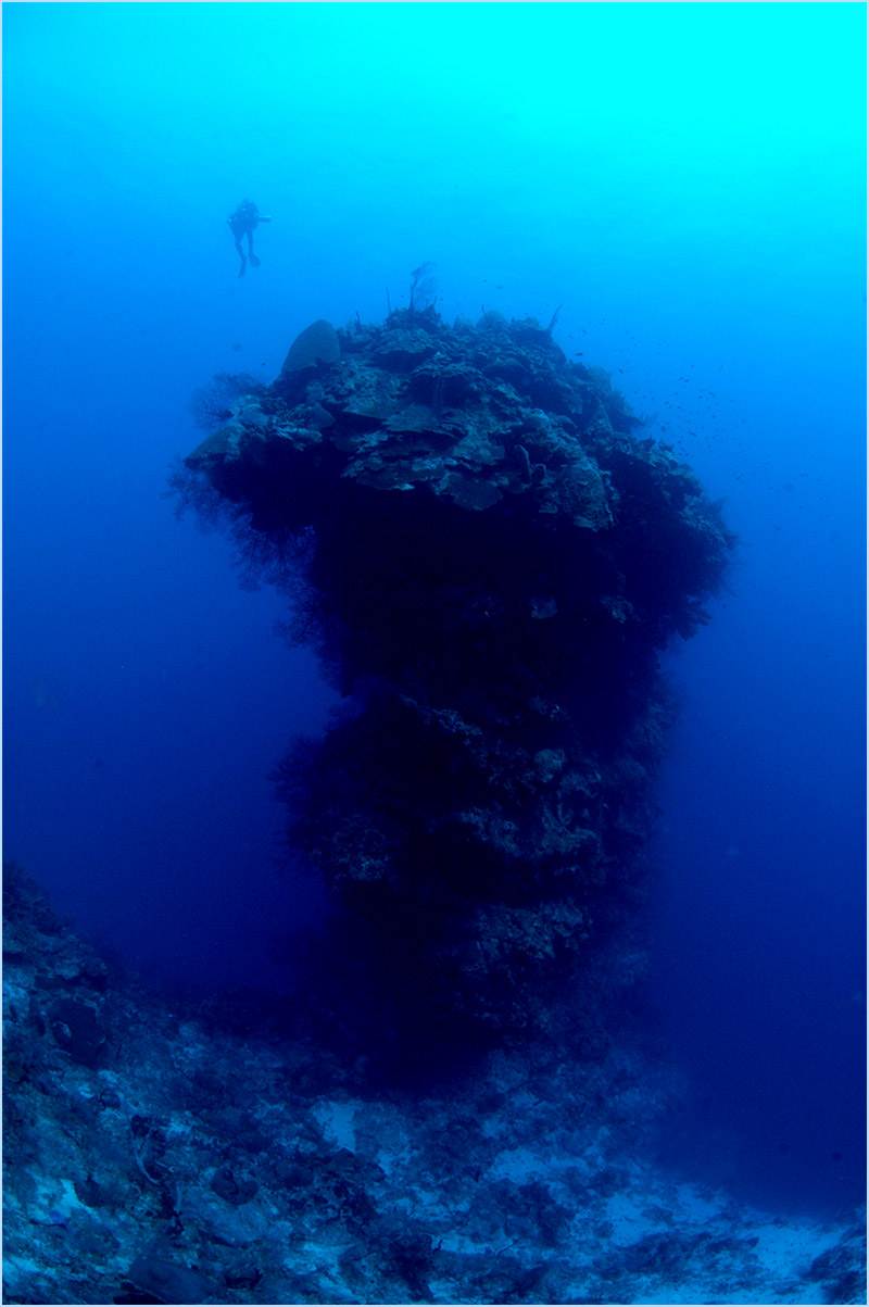 As you approach the pinnacle's end, an expansive view opens up before you, revealing hundreds of feet of near perfect visibility. In between the coral covered pinnacles, the winding wall curves inwards towards yet another pristinely white sand chute, creating a stunning contrast with its natural deep blue background that helps to display more flamboyant colored coral reefs to explore.