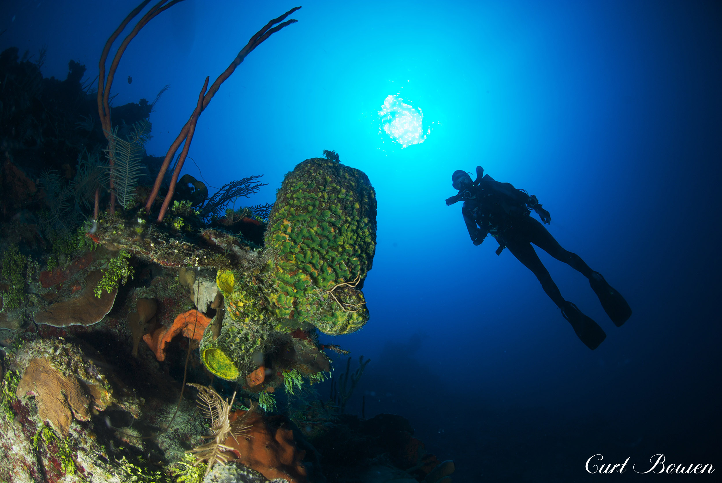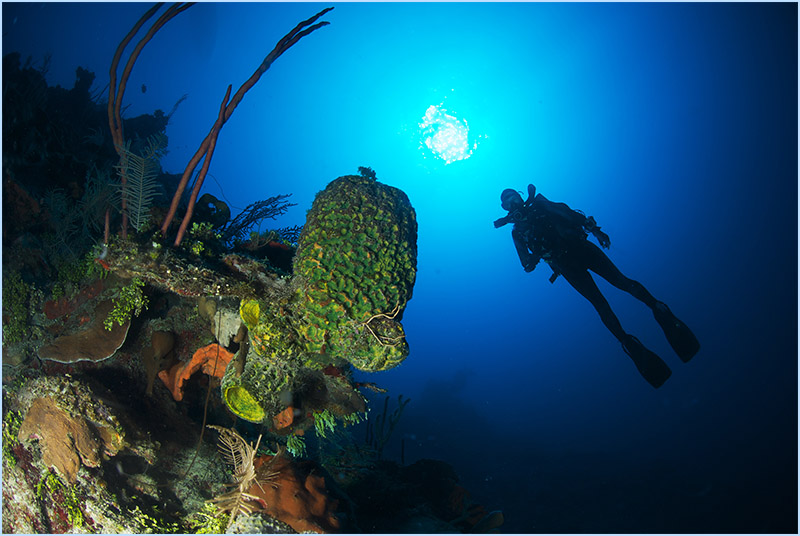 Don’t forget to look up. The view from below is breathtaking as the sun’s rays penetrate the surface, creating enchanting circles of light, visible from 300 feet below the surface. Your ascent will be nothing short of sensational, as you continue to observe the plethora of marine life forms that busily sail past virtually endlessly. Sights such as the Hawksbill turtles are certain to elicit a smile, owing to their characteristic behavior of slowing down to attentively acknowledging your presence. And the continuous kaleidoscope of sponges and coral colors that dress nearly every inch of seabed will leave you in wonderment of this peaceful, vibrant, underwater, art-museum.