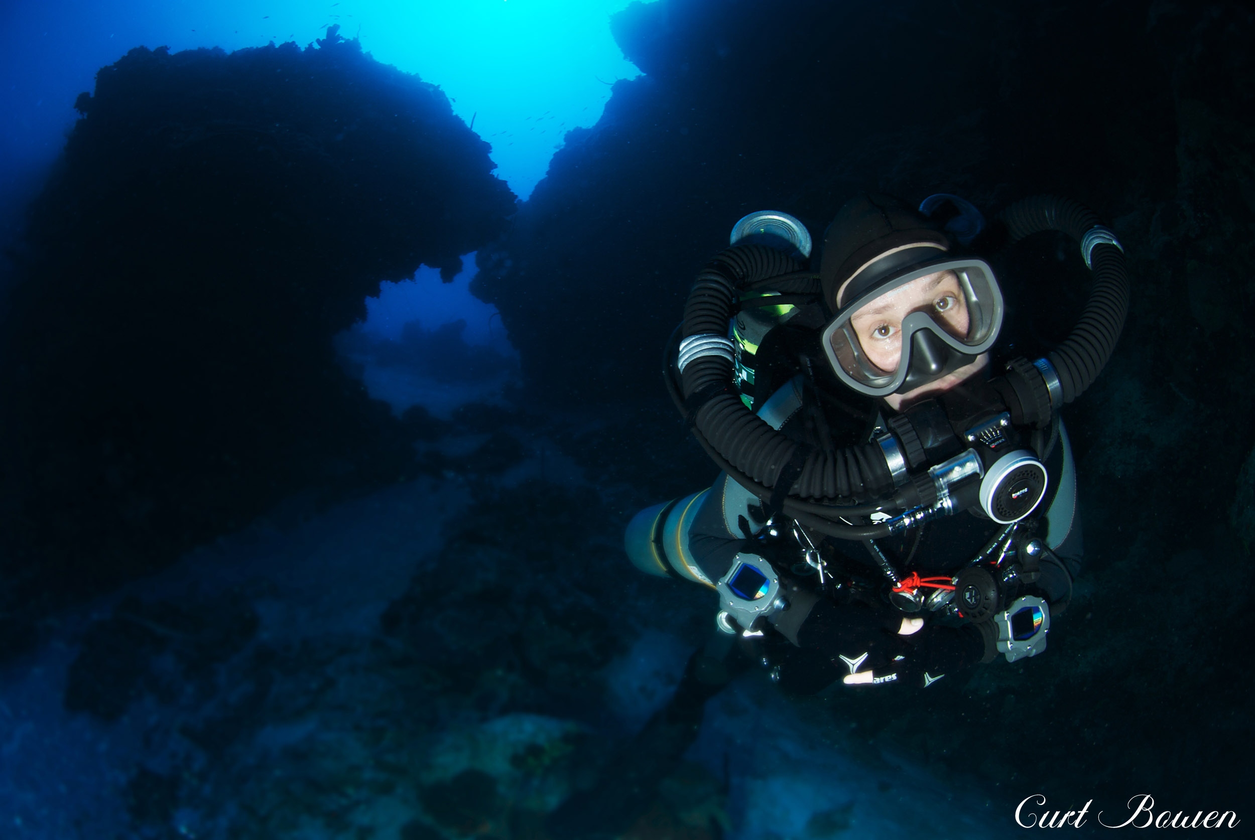 Holding your descent, you’ll notice the playful nudge of the placid current accompany you as you turn to observe the magnificent wall formations that curve sharply along the contour of the island. You’ll observe the strange and mysterious long arms of the black corals jutting away from their rocky anchors, bridging into the clear blue water. While noting how they oddly resemble the fruitless branches of autumn’s barren trees. Occasionally, a curious, lonely lobster will peek out to observe your presence, stretching out their antennas, keenly detecting your vibe as they purposely watch you swim past.