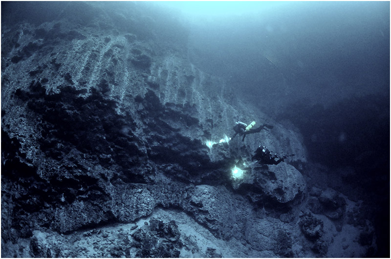 Darkness set in quickly, and the lights came out. Me with my trusty 10W HID and John with a prototype LED light head. As we descended, the wall undulated from ledge to undercut. Descending even deeper, it was as though someone turned the “Scale” knob up – all of the features appeared rougher, less worn, and larger gaps appeared between eroded walls. The undercuts also became more severe. This resulted in a zigzag swimming pattern in order to stay in visual contact with the wall.