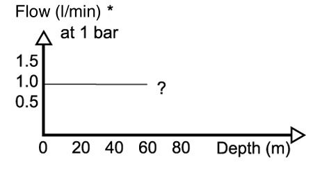We now dive to 50m: P1 = 15 bars, P2 = 6 bars, we still have maximum flow, (15 > 2 x 6), but the density has increased by 50%, and so has the mass flow, and we now have +/- 2.14grams/liter (equivalent to a flow of 1.5l/min at the surface)