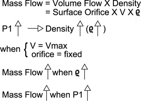 Example: When we meet the conditions of sonic flow (Vmax), so that we have Constant Volume Flow, but we double the inlet pressure at the orifice, we double the density of the gas, we will double the MASS flow through the orifice.
