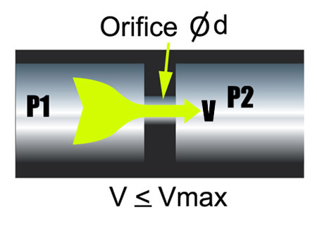 When a gas is pushed through a small hole, also called orifice, or nozzle, the speed of that gas is limited and can never be higher than a certain maximum speed, also known as the sonic speed (Vmax)