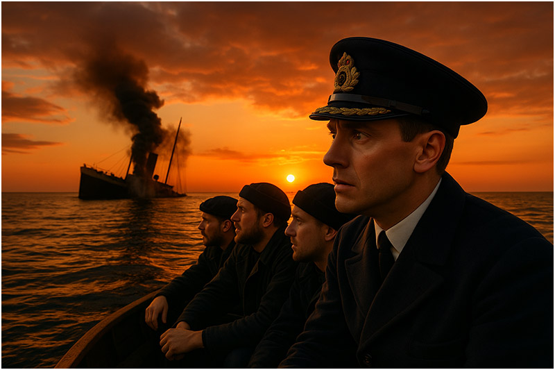 A deep, muffled roar came from within — the boilers blowing. She shuddered from bow to stern, her lights blinked once, twice… then darkness.