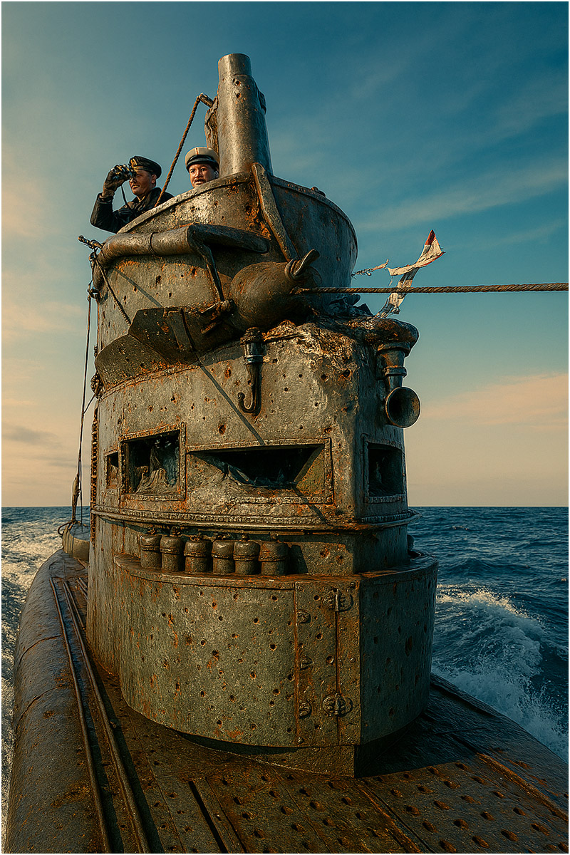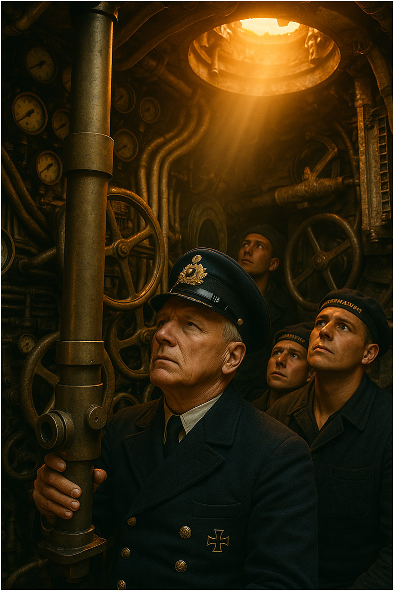 Above him, the watch officer turned the Zeiss periscope in its housing, the mechanism squealing faintly. The last embers of daylight spilled through the narrow hatch — North Sea skies lit in streaks of red and gold, as if the horizon bled into the clouds.