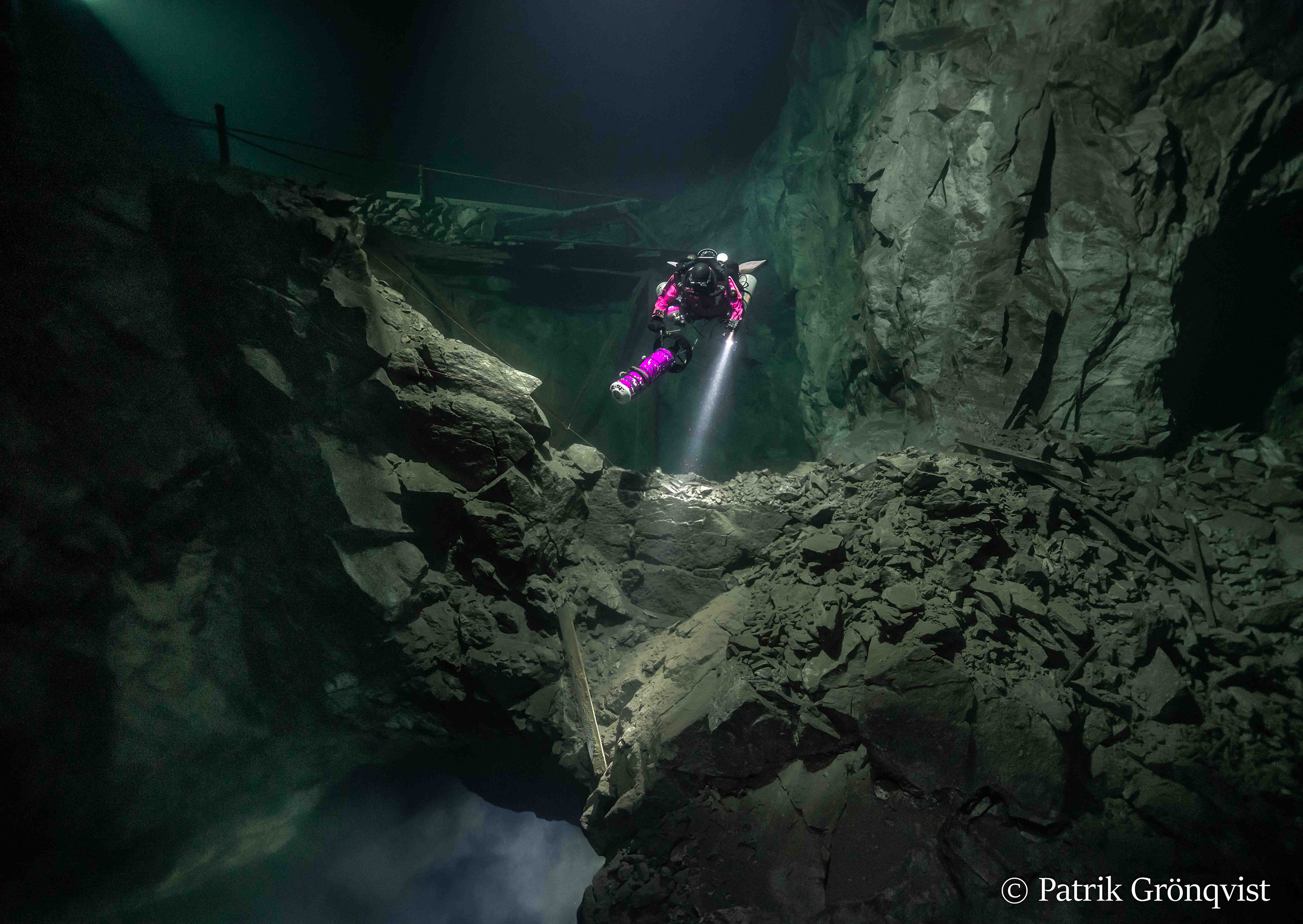 Montola Mine – “Sacrificial Altar” – At 45 m depth, a diver hovers above the collapsed rock formation known as the Sacrificial Altar, where fallen stone drops away into darkness. Montola is a flooded hard-rock mine, excavated deep into Finnish bedrock during the 20th century and later abandoned, allowing groundwater to reclaim its shafts and stopes. In 4 °C water, precision buoyancy and light discipline are essential as the mine’s vertical geometry, old workings, and unstable rubble define both the beauty and the risk of this site.