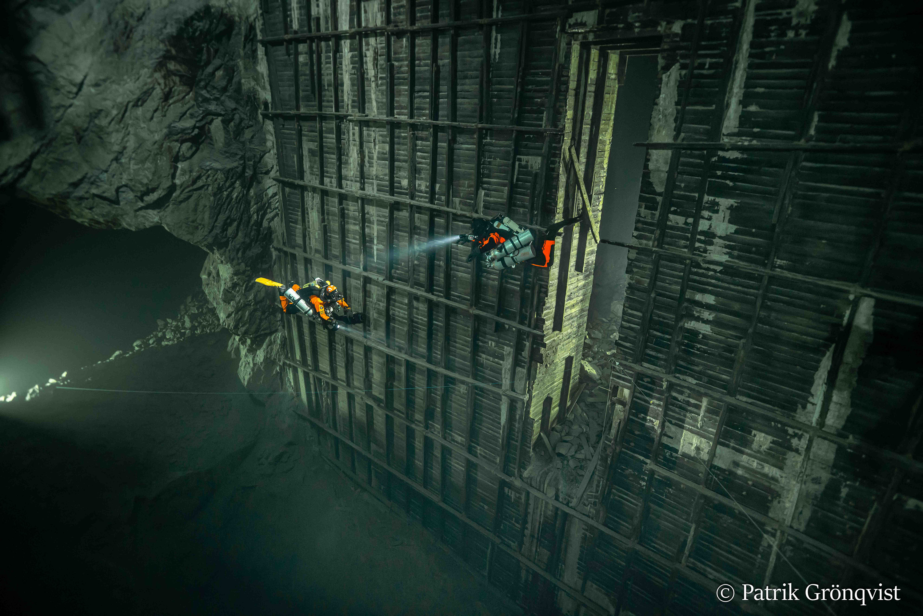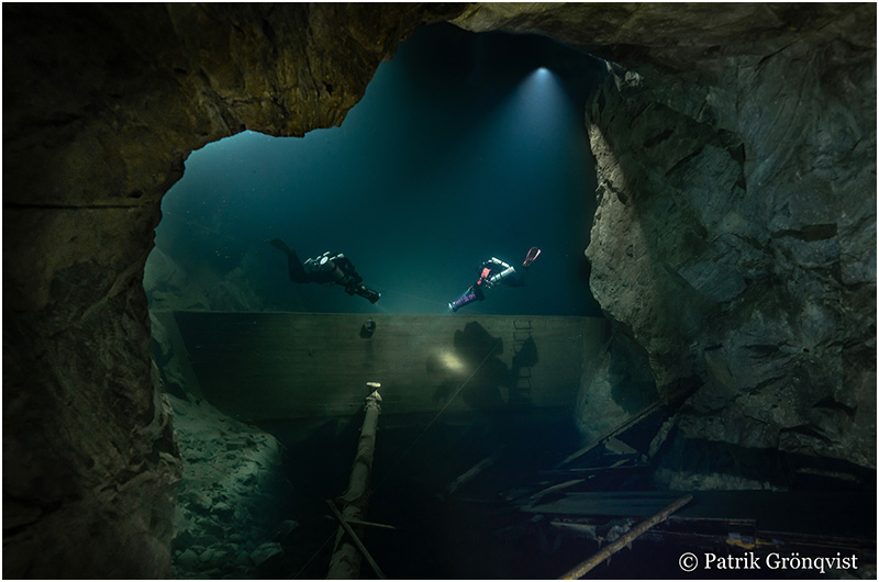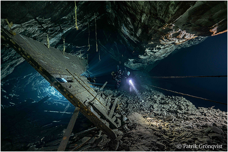 Björnbron, Långban Mine — Sweden — At 60 metres depth, a technical diver passes beneath Björnbron, an old rock-cut rail cart bridge left in place to carry ore trains across an open void inside the Långban Mine. The solid stone span once supported heavy mine rail traffic, while the collapsed timbers, rails, and cables below mark the remains of the transport system that fed this deep industrial complex. Now submerged, the bridge stands as a striking example of underground mining engineering, where precise buoyancy and controlled movement are essential beneath the overhead environment.