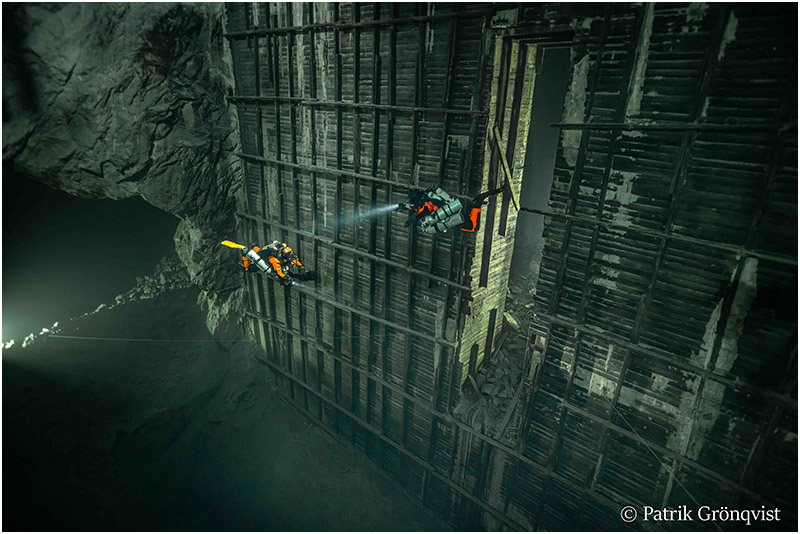 Lucifer’s Pillars — Two deep mine divers illuminate Lucifer’s Pillars, a colossal reinforced concrete column rising from the silted floor of Ojamo at approximately 60–75 metres depth. Measuring roughly 4 × 4 metres, the pillar stands directly beneath the ominously named Hell’s Gate, engineered to bear the immense weight of the rock above. Powerful video lights cut through the cold, clear water, revealing drill marks, fractured bedrock, and the stark geometry of human construction embedded within a vast subterranean void. The divers’ scale against the pillar emphasizes both the ambition of the original mining operation and the psychological weight of exploring such depth in total darkness.