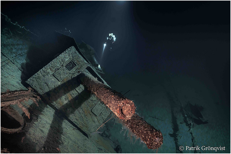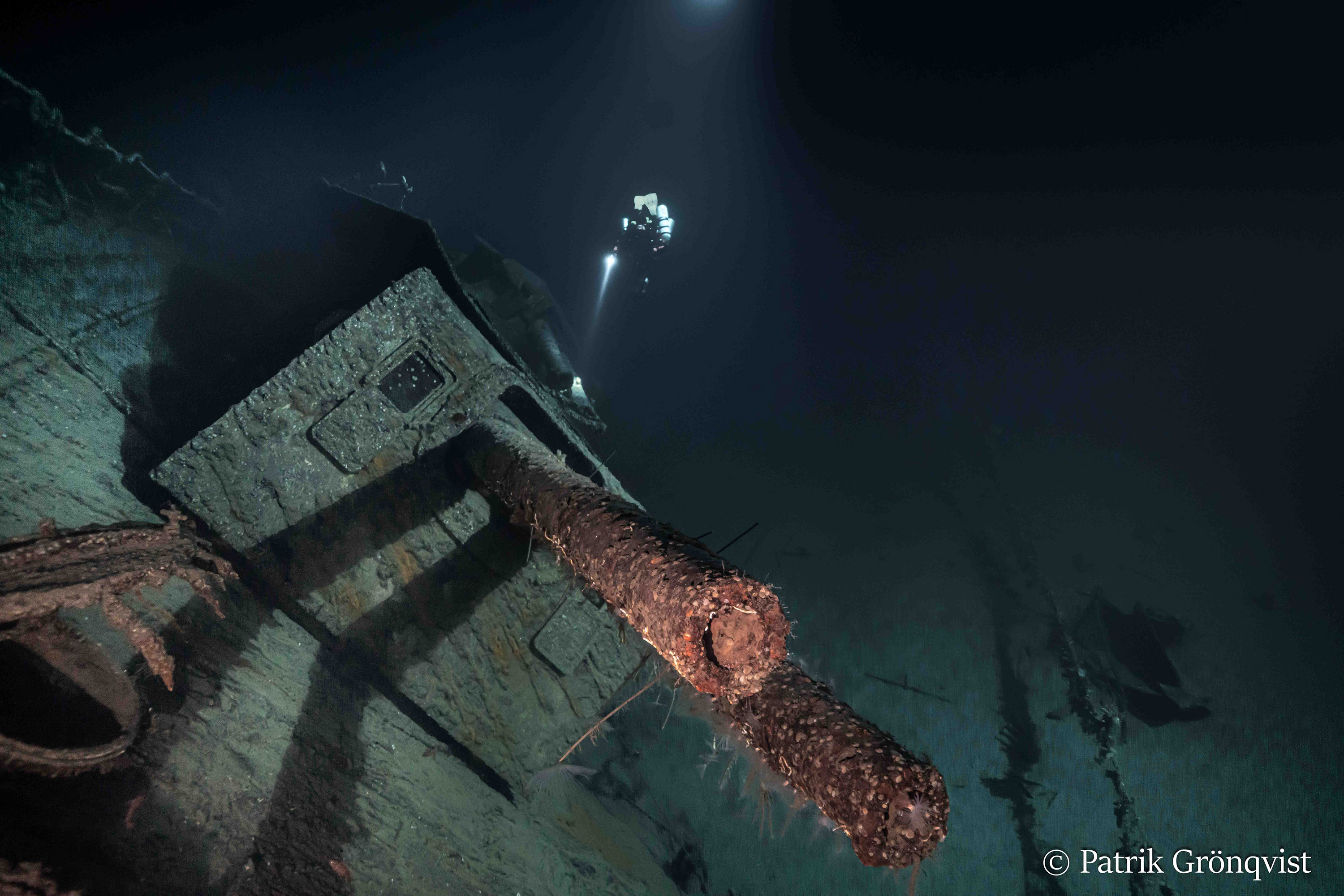 ORP Grom — Polish Navy Destroyer, Narvik, Norway — A technical diver pauses above one of the large deck guns of the Polish destroyer ORP Grom wreck, resting in the darkness of Ofotfjord at 90–110 metres depth. Once trained on enemy ships and shore positions during the fierce fighting of the Battle of Narvik in 1940, the gun now points into silence, its barrel encrusted with decades of marine growth. The scene captures the transition from wartime violence to stillness, as the wreck endures as a protected war grave in the cold Arctic water.