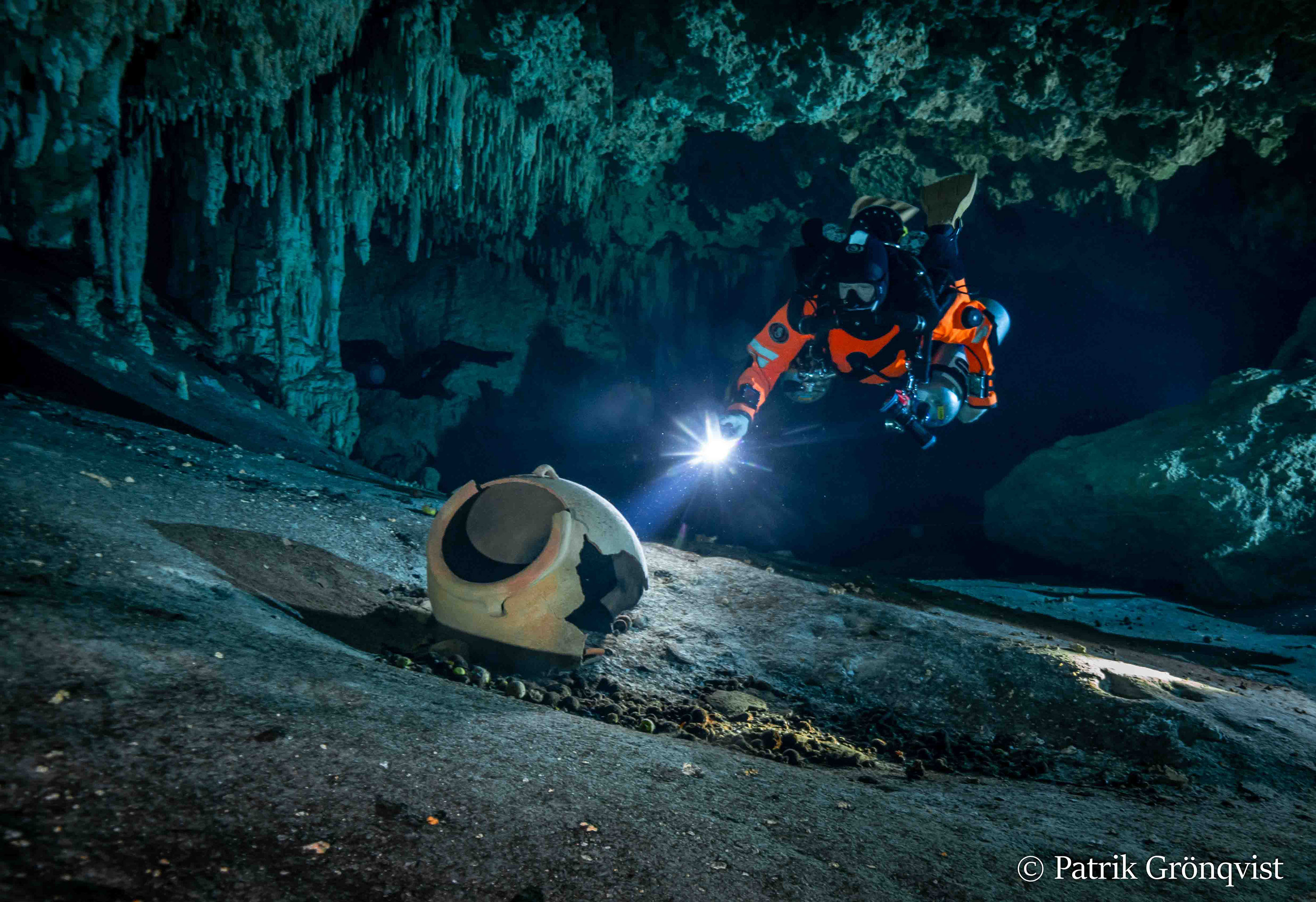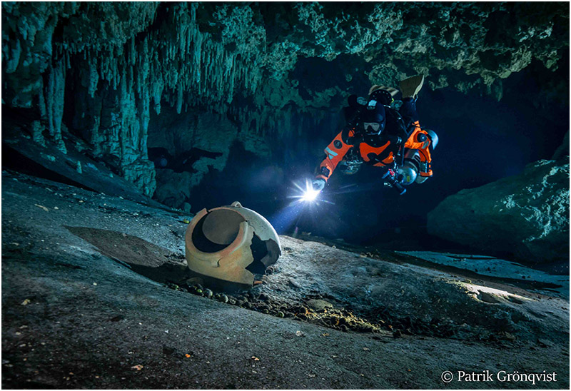 Cenote Fenómeno, Mexico — A technical cave diver carefully approaches a fragile ceramic vessel left behind by the ancient Maya, resting undisturbed on the silty floor of this submerged passage. These pots, once used for ceremonial or domestic purposes, offer a rare and intimate connection to the people who entered these caves centuries ago, long before they were flooded. Today, the cenotes are silent archives of Maya culture, where archaeology and exploration intersect in total darkness. Precise buoyancy and controlled lighting are essential to document these artefacts without disturbing the surrounding sediment or history they represent.
