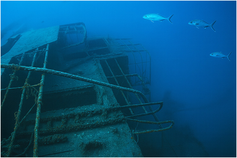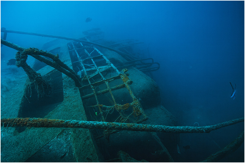 Railing still adorns the perimeter of the wreck. Swimming towards the stern, numerous hatches permit access to the interior. Divers can follow rows of portholes aft until eventually encountering the large single screw on the terminus of the sloping hull. Crossing back over to the upper decks, machinery and booms provide a unique scene near the fantail, while large hawser lines float 50 feet upwards from the wreck. These lines used to float on the surface for several years, which helped to expedite the location of the wreck.