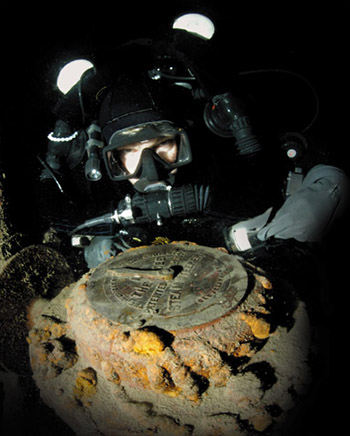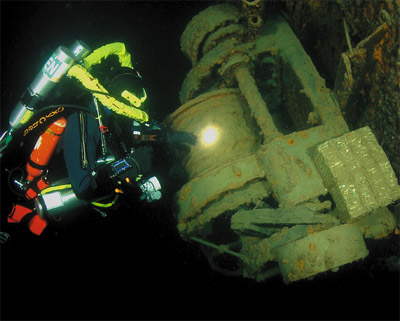 Since this would be my first cold water dive in the northwest of Lake Superior, Ron thought it would be best to break me in by doing a somewhat shallow dive on the Kamloops stern. Suiting up in my extra warm Weezle Extreme Plus undergarment, Dive Rite’s 905 drysuit, extra thick hood and a pair of wet gloves, I donned my KISS classic rebreather, a 40 cubic foot stage of oxygen, and an aluminum 80 air for emergency bailout. Standing on the dive platform with Mel Clark, Ron handed me my underwater camera housing and strobes; and with a giant stride step backwards, we entered the water. Brisk, was my first thought about the 50 degree water. But not so bad, I said to myself as we swam to the descent line. Dumping the air from my wings, I followed the 1-inch polypropylene stern ascent line as it dropped straight into the darkness below. |