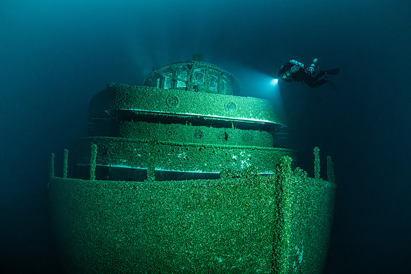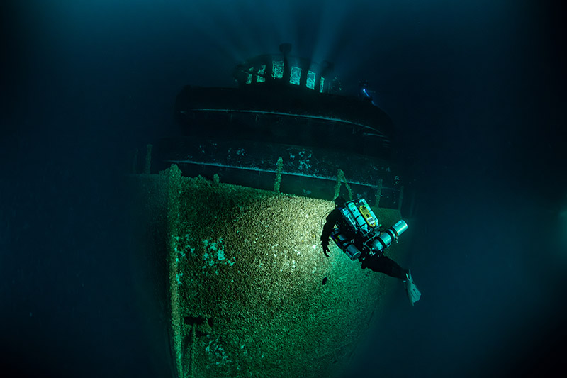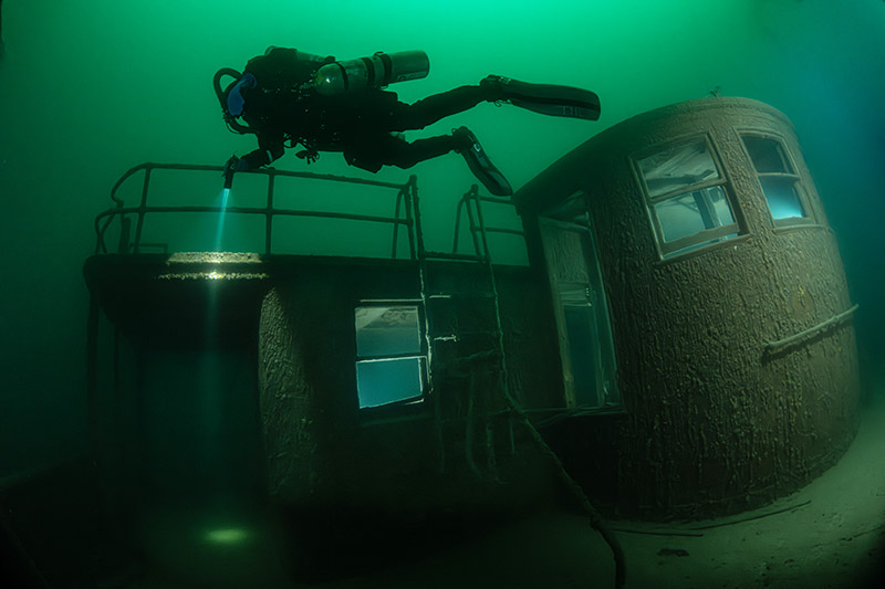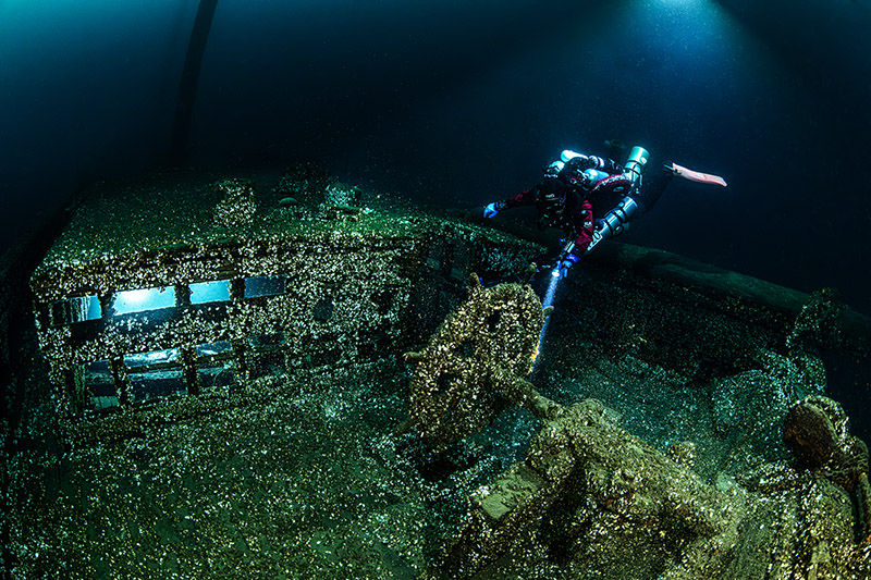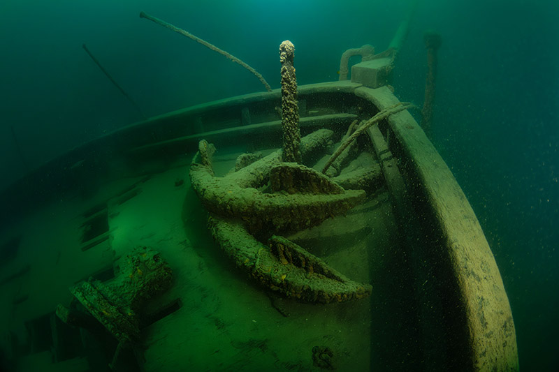 On this dive, I chose to focus on a single area, with Bob Larson lighting up the impact damage to give the scene scale. The beautifully clear waters of Lake Huron made the shot all the more rewarding—a rare treat in itself.