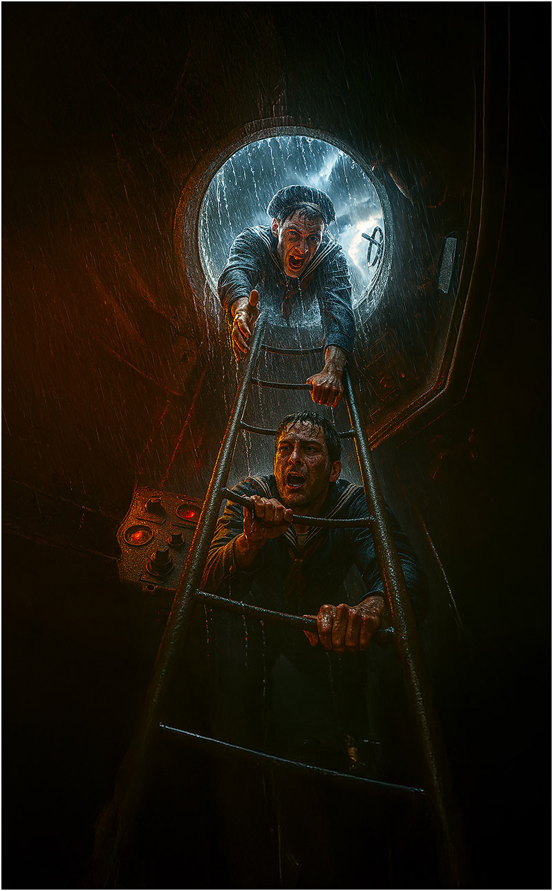 One after another, four men clawed their way up the ladder and out into the storm. The sea met them like a living thing, hurling spray across their faces, tearing at their oilskins. They tumbled onto the slick casing, coughing, gasping, gripping at handholds as the submarine bucked beneath them. Behind them, water poured through the hatch in a torrent, hammering the control room below, flooding the gauges and extinguishing the lights with sharp, sparking pops. The M1 shuddered like a wounded beast, tilted bow-down, and began her fatal plunge.