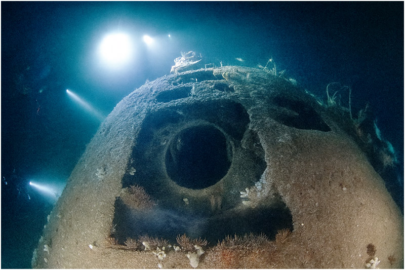 Photo above: Divers exploring the wreck of HMS M1 discover her conning tower hatch still open — a haunting clue that, in her final moments, someone inside had lifted it, allowing a handful of men to escape into the storm while sealing the fate of those trapped below.