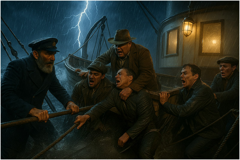 “Get him in!” McKay bellowed. With brute force, he and Fox dragged the limp, gasping Lambert into the boat. Wallace and Lang heaved from the other side, their arms slick with rain and blood. Middleboro fought the ropes loose, and at last the lifeboat broke free.