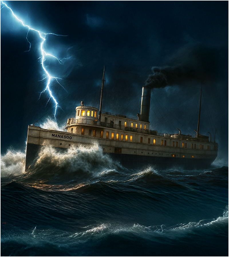 The effect was immediate, devastating. The Manasoo lurched violently to starboard, her rail plunging down toward the waves. Within minutes, she was over, lying hard to the gunnel, her decks at a near-deadly angle.