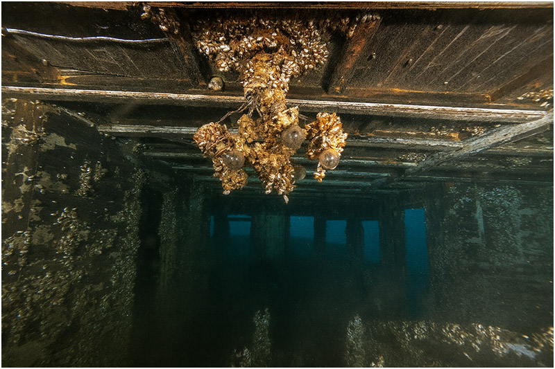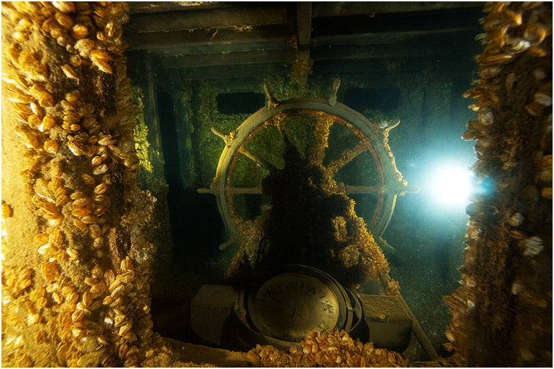 Swimming slightly forward of the bow and gazing back at the wreck, it looks very much like a ghost ship that could continue steaming on if suddenly lifted from the water. The starboard side railing leading up to the wheelhouse, which unfortunately has since fallen, was once strangely devoid of mussels or growth, as if scrubbed by unseen hands. Some of us joked that ghosts kept it clear, though it was probably due to the type of metal used in the railing. Still, it makes for good folklore.