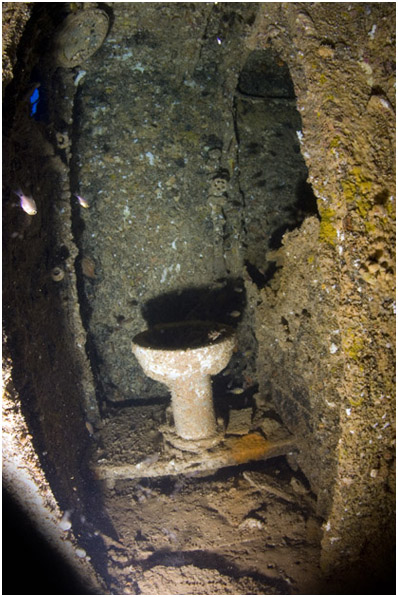 On reaching the bow, the open break allows a diver to venture within and examine the interesting upturned interior of the hull with many working mechanisms and machinery to be seen. It is inside this section of the wreck that more human remains can be seen, as well as personal artifacts and broken fans that would have kept the tightly packed rooms of sailors cool in the Pacific heat. In addition to this, broken china tea cups, plates and saucers. A second torpedo may have struck the bow section, as there is a large hole on the starboard side and an even bigger exit-type hole on the opposite side!