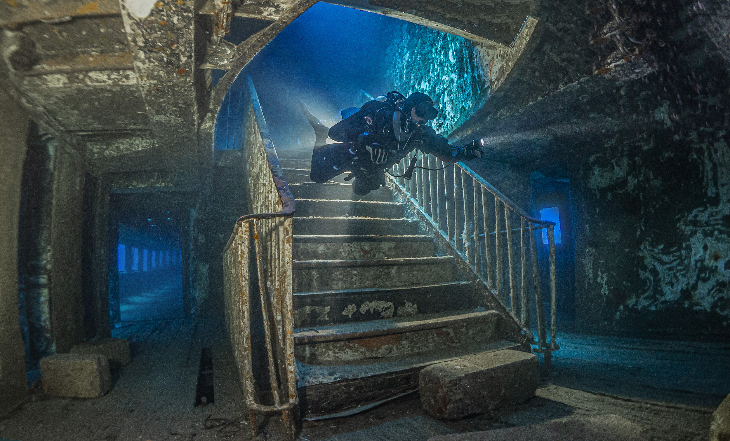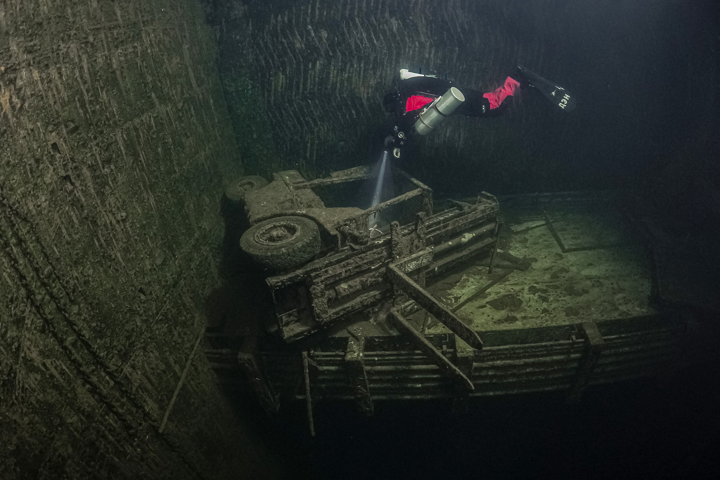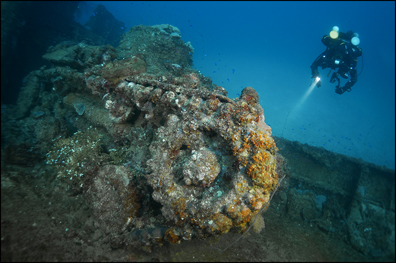 Above: Underwater photographer freediver takes pictures of the ferry Zenobia, Cyprus, depth 30 meters