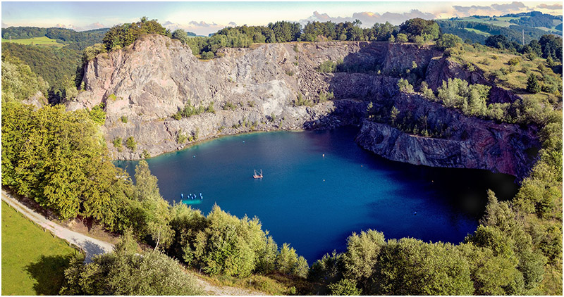 Once you reach the small road leading up the hill in the village of Messinghausen, you will wonder where the lake is. Welcomed by some grazing cows, passing a gate—then you will see it: A former rock quarry, about 141 feet / 43 meters deep and 330 feet / 100 meters in diameter, filled with crystal-clear blue water. What looks like an enormous cooking pot is a manmade structure with a path going around and the steep walls continue below the surface. “The cooking pot description is accurate,” says scuba instructor Matze Schneider from the dive center in Bielefeld. On weekends in the summer, there can be over 50 divers with their bubbles boiling on the surface like a giant cooking pot.