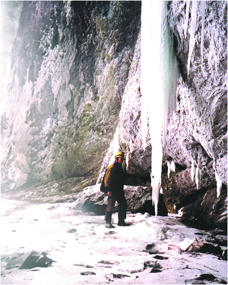 A small part of the resurgence was free of ice, but the cave mouth was full of ice Stalactites and stalagmites and the view out was stunning.