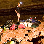 Unfortunately for both Challen and Harris equipment problems meant that they were unable to reach the end of Challen’s line laid in 2008. As disappointed as they were, they would wait for the word of Rick Stanton after he had made his attempt of just how much further a diver can explore. On the surface, the progress of each exploration divers was being monitored using radiolocation pingers, which also helps to map the cave system. Below the surface my plan was to see Rick safely off from the lake and later that night meet him at the ‘Rock Pile’ between sump one and two. From the rock pile, I was able to radio the surface and let the camp above know Rick was back safe, which was, of course, when he arrived. Ric acknowledged Agnes Milowka in passing in sump three just before the waiting room, then eventually reaching the end of Craig Challen’s line, Rick tied his own line off to the end of it before progressing only a few meters. Here the cave takes on the nature of wide bedding plane possibly 20-30m wide, only big enough for a diver to navigate by passing through rock erosion features and channels in the floor. Rick had little if anything to belay his line to and found the going elbow deep in mud with zero visibility. As this is a percolation cave, it appears that the point reached by Challen in 2008 could well be the source of the water intake. Rick reeled in the few metres of line he ran out and retreated, claiming no more passage to be found and that Challen had officially got to the most remote part of the cave the year before. Quite possibly more progress could be made, but at this point in the cave there is little possibility of it opening up again and it will certainly become too small for a human to progress not far beyond. Agnes Milowka and Ken Smith were back at Toad Hall to video Ric's comments on his push dive before exiting themselves and bringing with them a haul of cylinders, which began the big ‘after push’ clean up.