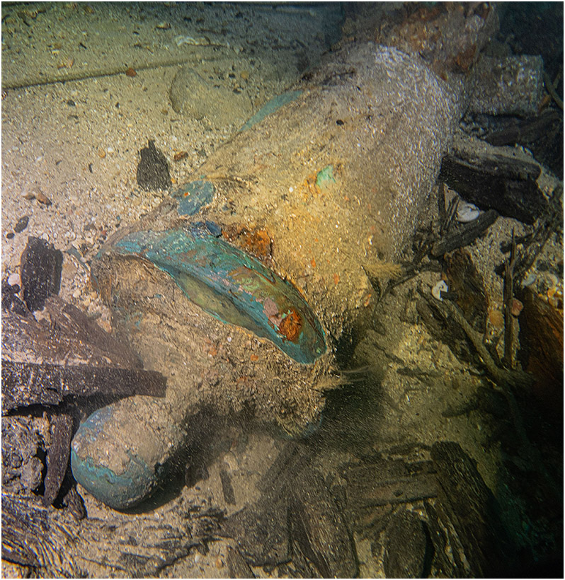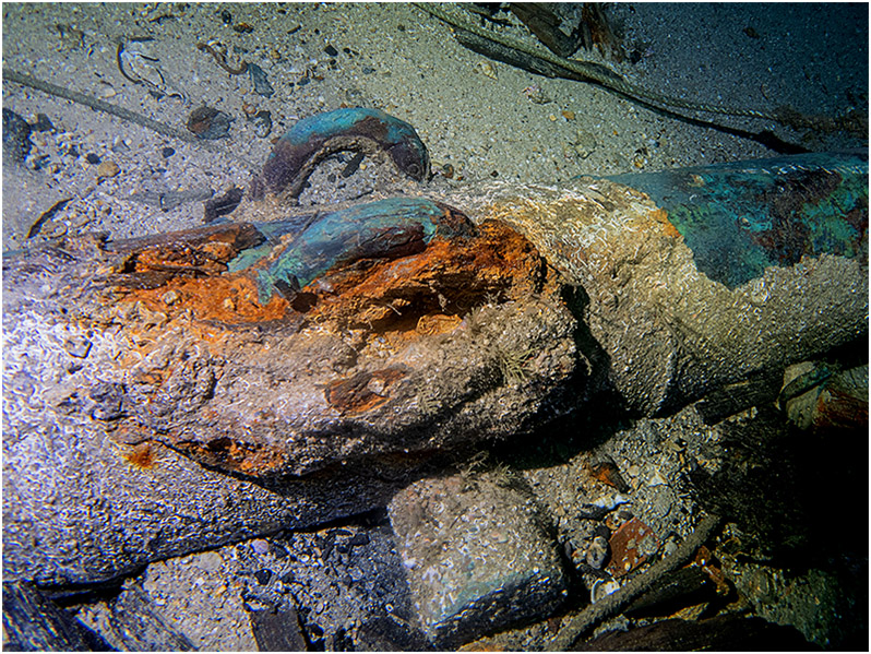 To the west, around 40 iron ballast ingots mark the probable keel line, cast by Miles Troughton at Sowley. Their position suggests the ship struck the seabed on its starboard side, collapsing eastward over time.