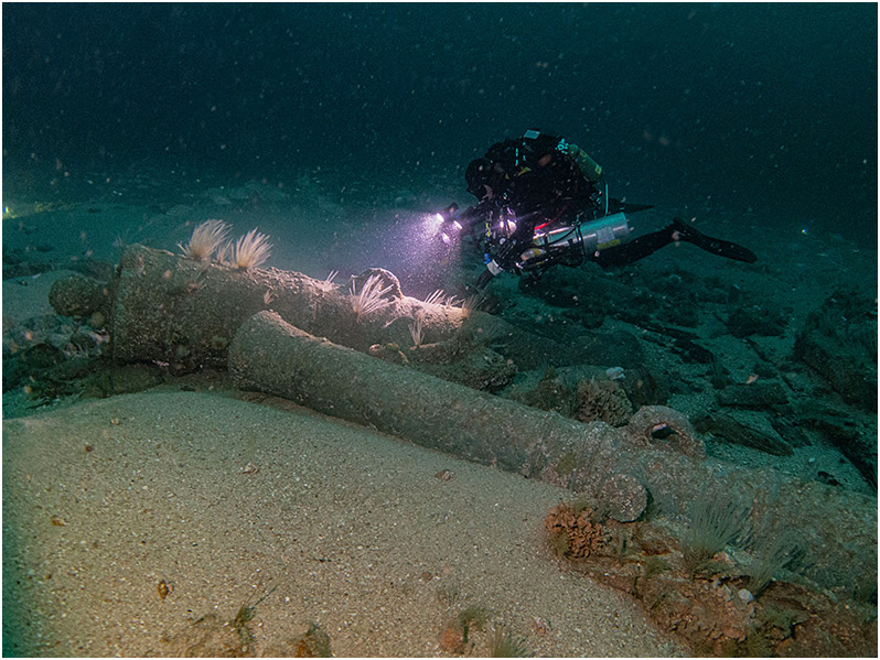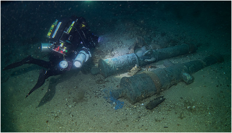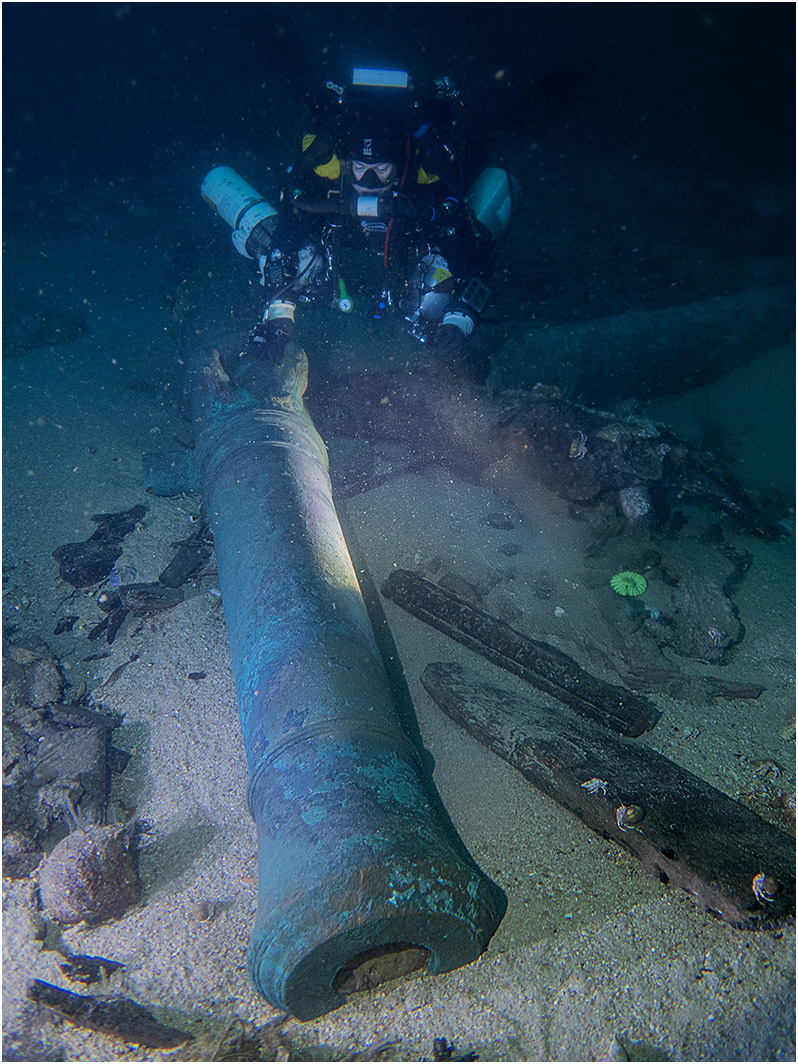 The shipwreck lies over 100 kilometers beyond UK territorial waters in 255 feet of water, far from the traditionally assumed site near the Casquets. To investigate, the UK Ministry of Defence authorized Odyssey Marine Exploration to confirm the wreck’s identity by surveying the site and recovering two bronze cannons.
